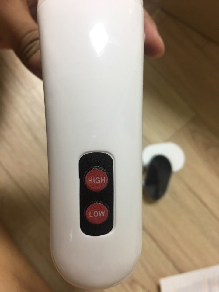 오른쪽에는 전원 버튼과 모드를 변경 하는 버튼 / 왼쪽에는 강도 조절 버튼이 있습니다.