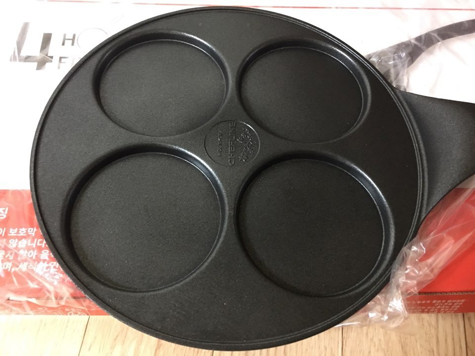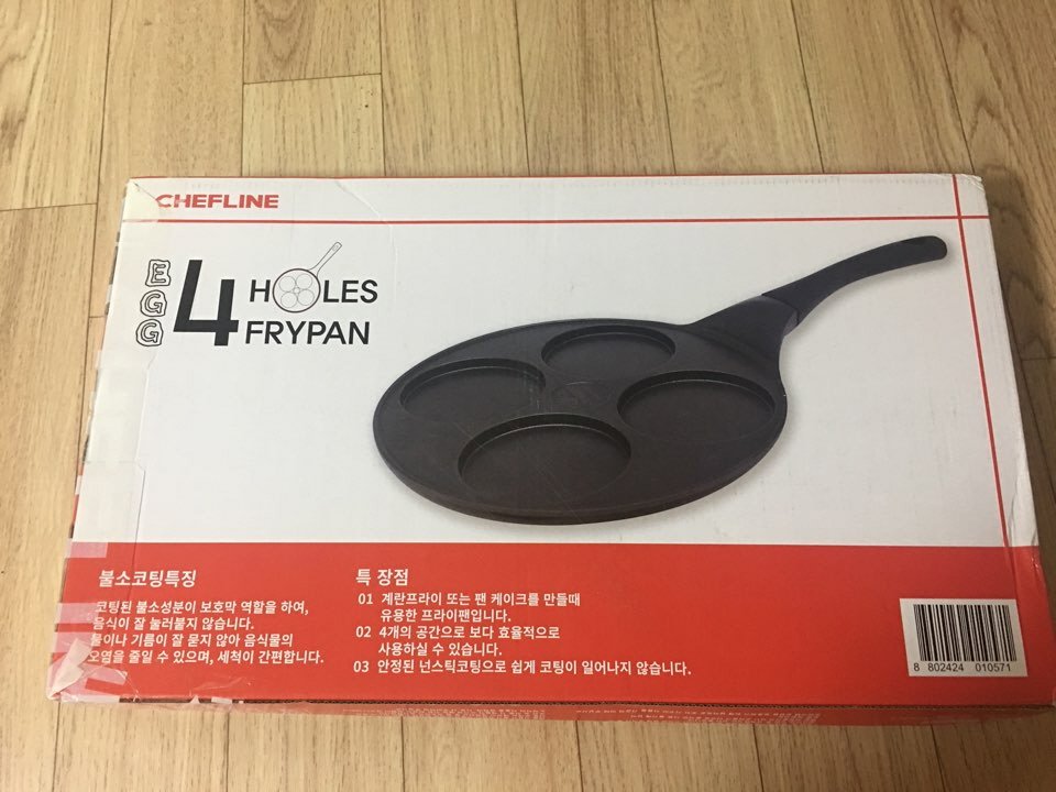셰프라인 4구 후라이팬이라고 나와있네요 계란 전용 프라이팬 치고는 좀 커서 보관하기가 사실 뭐 좀 불편하다고 해야하나요 우리가족은 둘 뿐이라 사실 4구는 필요없었는데 ㅋㅋㅋ 이게 다 윤식당 때문이에요 ㅋ