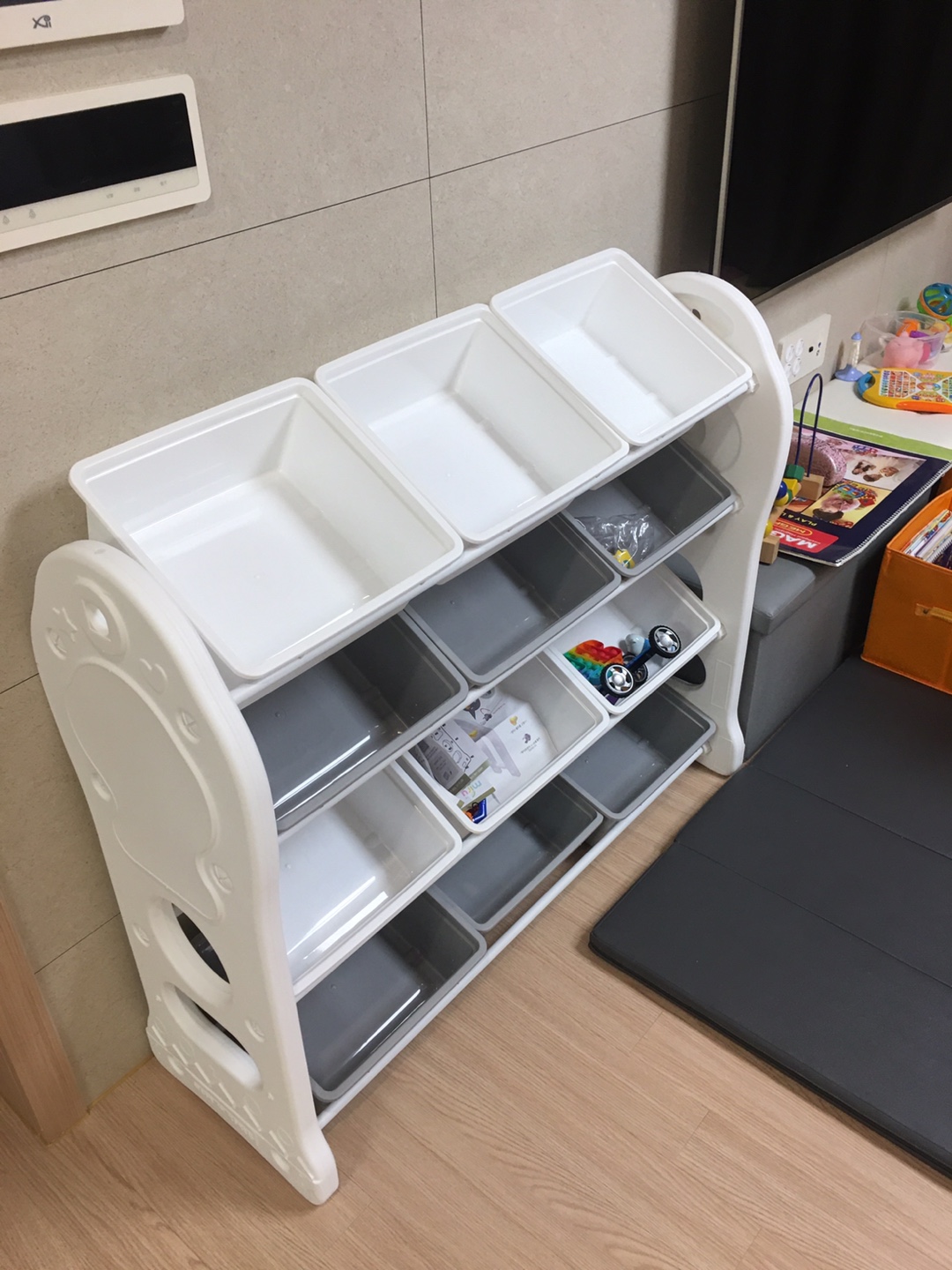 쨔-안 예쁜 장난감 정리함이 깔끔하게 자리잡았습니다.
