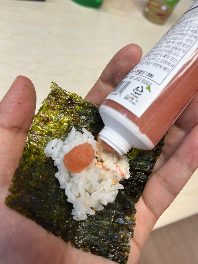 김 위에 밥을 얹어서 그 위에 크래미 와사마요와 함께 덕화명란을 딱!