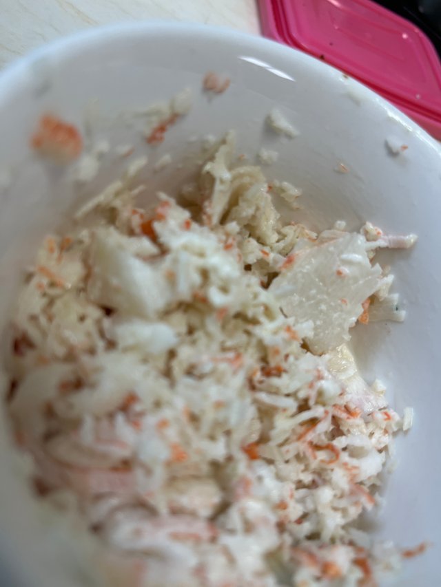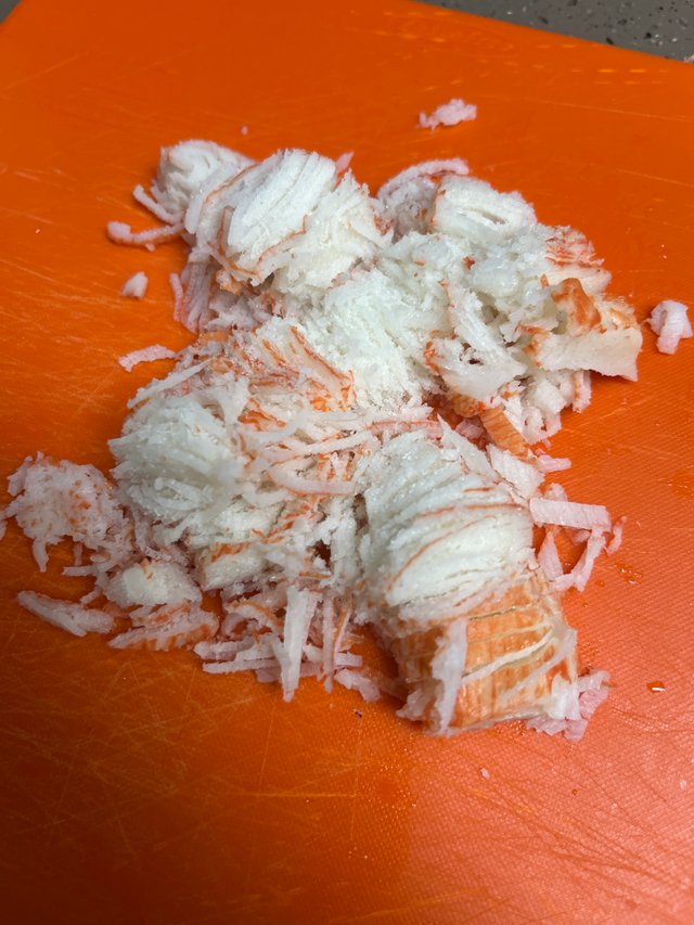 냉동 시켜둔 크래미 3개를 꺼내서 사각사각 다진 눈꽃(?) 크래미를 만들어버립니다.