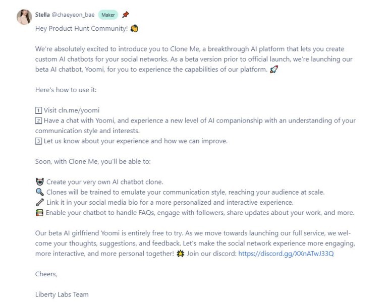 프로덕트 헌트에 올라온 대표의 소개글입니다.