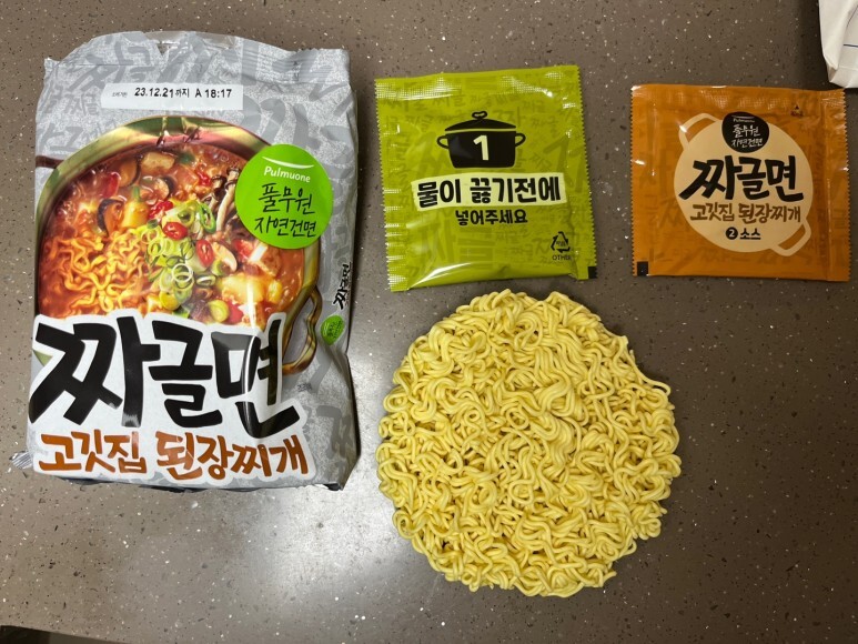 짜글면은 풀무원 특허의 건면을 사용합니다. 풀무원 건면 식감이 좋아서 참 좋아하죠 소화도 잘되고해서 좋아합니다.