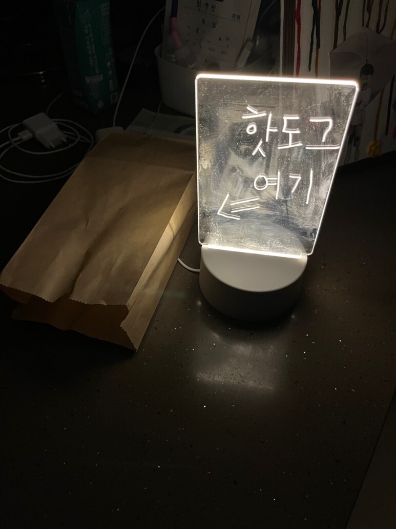 캄캄한 밤에 늦게 들어오는 가족들을 위해 LED 노트 보드에 마음을 아니 핫도그를 담아보세요