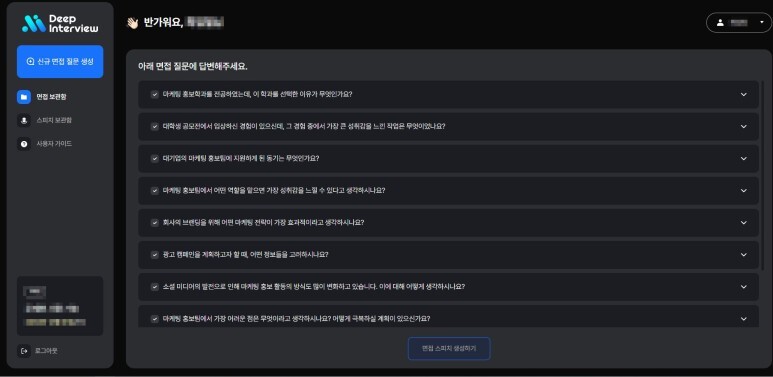 조건입력형으로 면접질문들이 생성되었습니다.