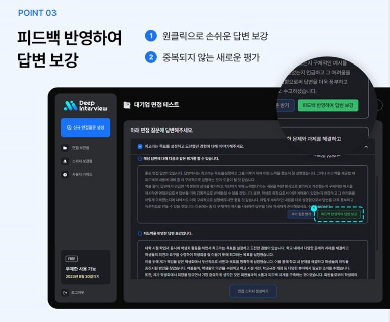 디핀터는 피드백 뿐만 아니라 ‘피드백 반영 답변보강'기능을 원클릭하여 최적화된 면접 답변을 제공합니다.