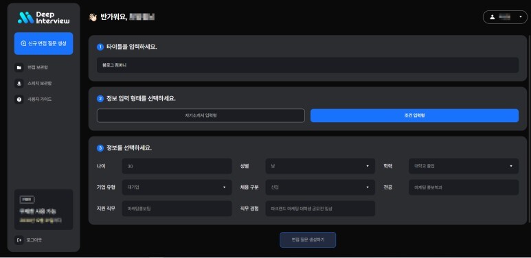 조건입력형으로 하게 되면 공통 질문, 인성 질문 같이 포괄적인 질문이 많이 나오구요 자기소개서 입력형으로 면접질문을 생성하게 되면 아주 디테일하게 전문 기술 질문들이 많이 나오는 편이라고 하네요
