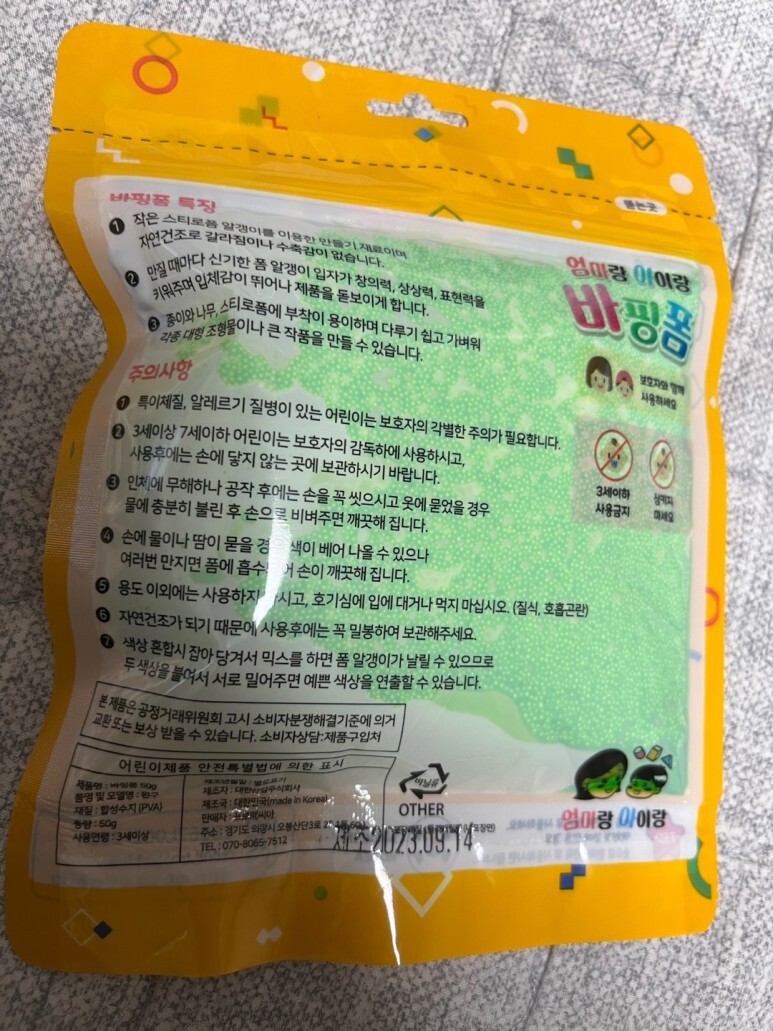 - 손에 물이나 땀이 묻을 경우 색이 베어 나올 수 있으나 여러번 만지면 폼에 흡수되어 손이 깨끗해 집니다.