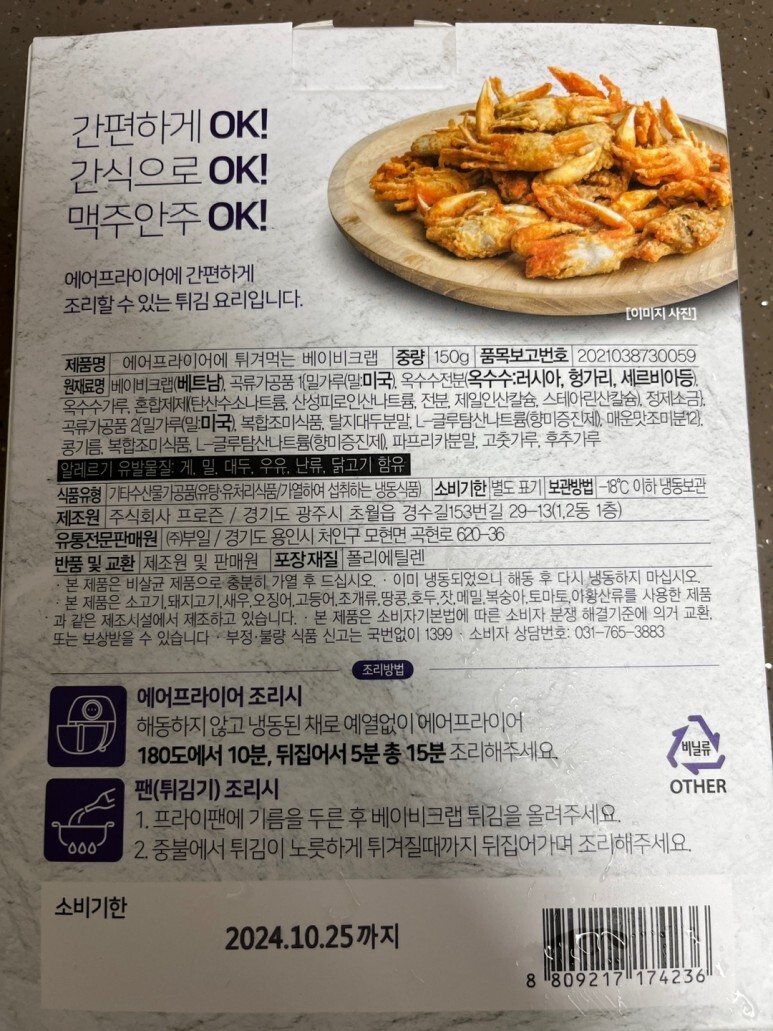 조리법은 에어프라이어에 냉동 베이비크랩을 넣고 180도에서 10~15간 조리하라고 나와있는데 그것보다 10분정도는 더 해야할겁니다.